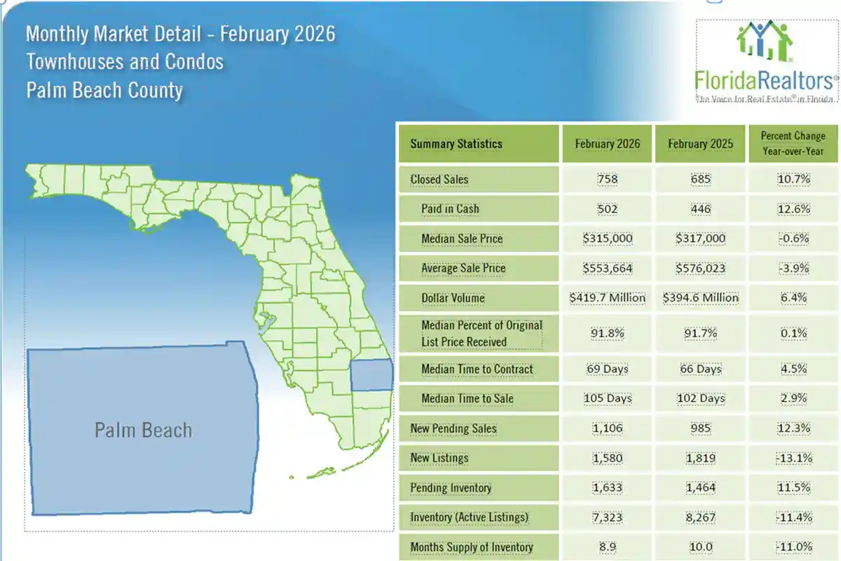The above table provides a detailed analysis of the residential condos/ townhouses in the real estate/ housing market in Palm Beach County, Florida for the March 16, 2026 Report with February 2026 Stats that highlights key statistics and trends.